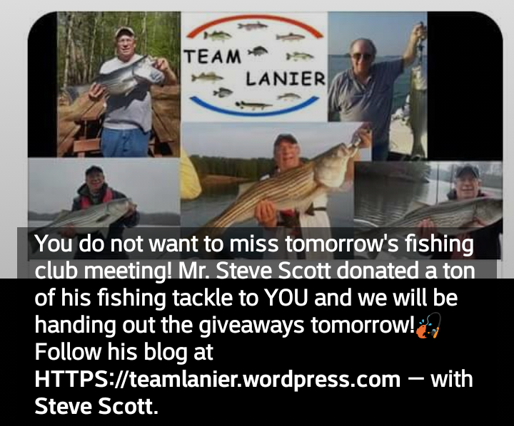 The concept of Team Lanier was a special club whose members did not meet anywhere except on Saturdays at no particular location on Lake Lanier but sharing detailed information about where the Stripers were currently being caught. The shared information was technique, method and bait.