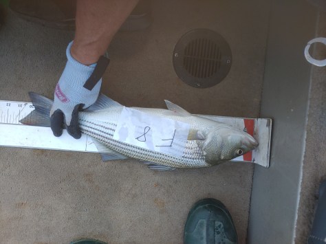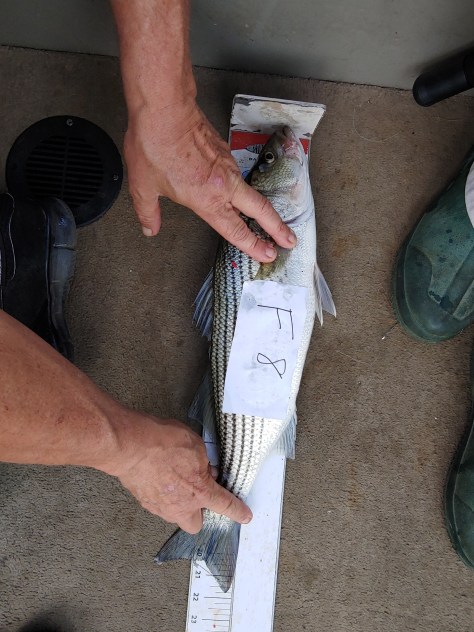 Those recent rains turned the water temperatures down again slightly and while they were back on the increase it was Fish On today. Bob & I caught 9 Stripes this morning 20′ down over a 25′ bottom in 80° water temperature. Rods were going down left and right until we ran out of bait. No telling how many we lost. We were down to one Blueback in the tank so we cut it half and both of us tried to catch one more each using the cut bait method each holding a rod. We even caught one Largemouth bass.
