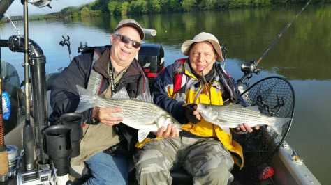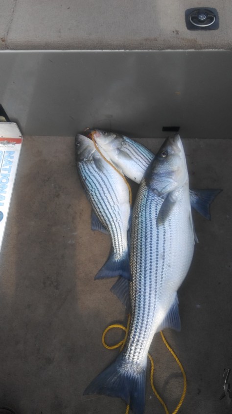 We loaded up with Blueback Herring and headed to East Bank park next to the dam. We were going to start here on a tip from the bait shop. Right after launching we put out a couple of Flatlines weighted and out 100’ & 130’. Before we could get another rod baited up it was Fish On. As we were bringing that 1st one the other rod started ripping off line. We got them both in for measurements and pictures.