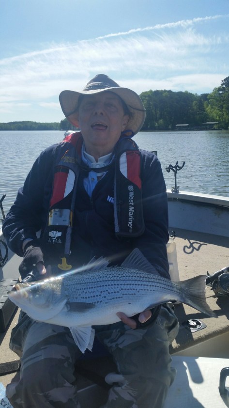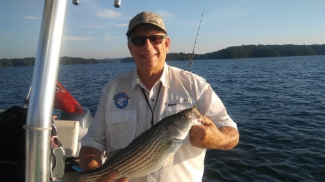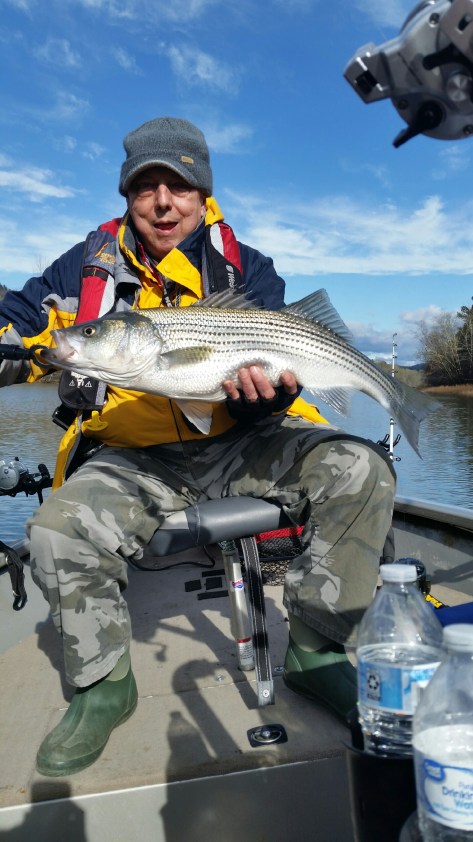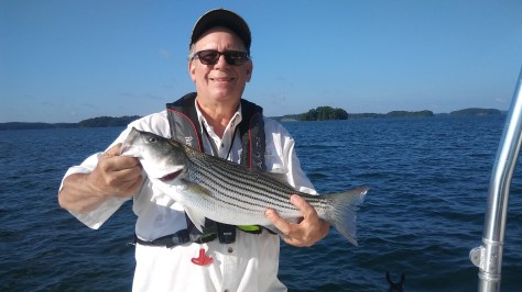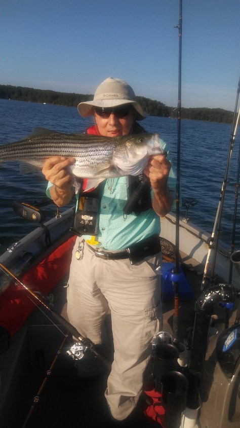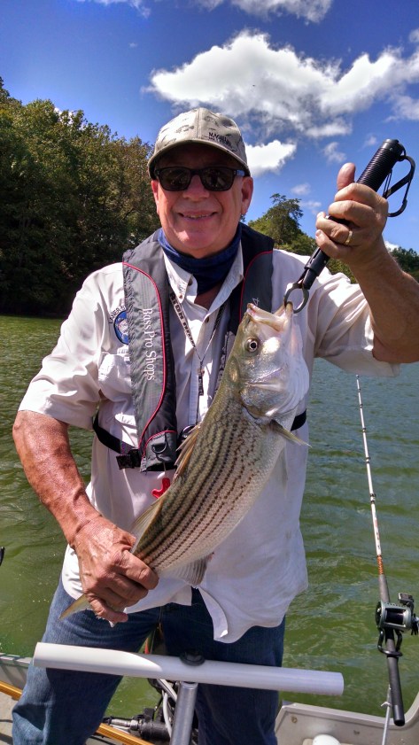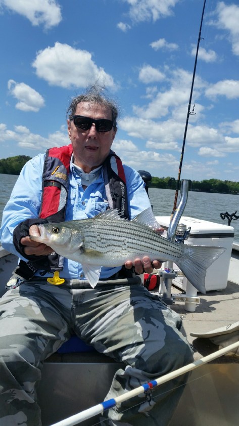 We were almost out of bait. I should have brought 3 dozen instead of two. We were also low on fuel so we headed to the gas dock at Holiday Marina. On our way in we came upon a center console barely moving. We thought they were fishing but realized they were not under much power. We slowed near them and they told us they ran out of gas and that the trolling battery was almost dead. So we towed them to the gas dock which is where we were headed. After grabbing some ice to put on the two Stripers we kept, we decided to grab some lunch at the Twisted Oar. We ran into some club buddies that had been successful pulling Umbrella Rigs. They said they tried some Downlining but with no success. They had five Herring left so they gave them to us. Well our bait soon ran out after snagging some trees. It was either quit and go home or get out the Lead Core rods. We used 2 different color 2oz. bucktail jigs and trailers, one pink and one chartreuse. Since the Stripers were down deep between 40-80′ we needed to seriously change our Lead Core presentation by decreasing our speed from 3 mph to 1.5 mph which would drop the baits to 36-40′, out 9 & 10 colors respectively. After a couple of hours the lake was seriously rougher than when we started. We decided to head back to the ramp to end the day.