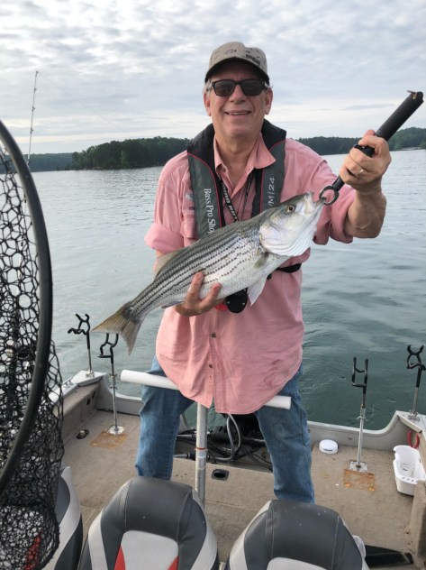 Four boats set out this morning for Team Lanier’s 2018 Tugaloo River Hybrid Run on a pristine morning with no wind, fog or rain in the weather forecast. After meeting at Oakwood Bait & Tackle to get our bait we were all to converge at the Rabbittown Cafe for breakfast then caravan up to the launch on the Tugaloo River at Stephens County Park. We headed north for the skinny water that I had visited in previous years for these fearsome fighting Hybrids. Bringing in one of these football shaped fish was a feat all on its own because they fought like a freight train making each fight memorable. The others scouted ahead as we slowly made our way through the narrow channels. One mistake getting off course would mean we would run aground in the mud. As our other boat captains were coming back toward us from the north it was stated that there were no fish to be had. They stated that the water temperature was 50 degrees. The area we were fishing was south of the Yonah dam. Since this was a weekday we were counting on the water generation to make the Hybrids active. Water coming out of the bottom of the lake would definetly be a lot colder than the Lake Yonah’s surface temperatures. We still forged northward in the hopes that our other captains were wrong. Well being a little patient here proved to be the right approach. The Hybrids came one after another then Don latched onto a 10lb 29″ Striper. It was a tremendous fight with Don on the front of the boat as the Striper moved from the right side to the left crossing and tangling several rods on the back of the boat. We ended up netting this monster on the left side of the boat. This fish came on a Planer Board with a Blueback Herring 40′ behind the board. Its size was totally unexpected. We wanted to call out to the others but we either had no signal bars or no more battery to contact them. They should have hung with us instead of the “gun and run” technique they were accustomed to.