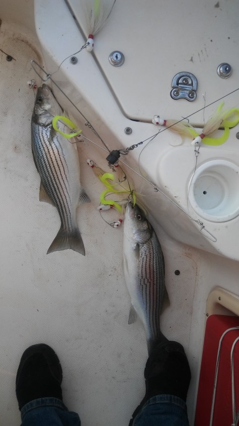 We launched from Old Federal Park ramp today at 7:30am. After a Facebook post from a fellow Striper angler who strictly uses Umbrella Rigs and already put a fish in the boat, I took that as a sign to at least start with this technique. Five minutes after putting out a Urig it was Fish On and a double at that.