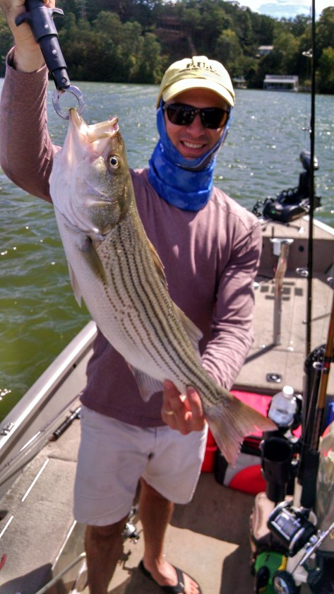 With a little bit of wind and a plethora of boats on Lanier today it was a bit rough on the water. We left Vanns Tavern ramp at 7am and headed for the Six Mile crossroads. Surface temp was 89.1°. Bait care would be of great concern as Blueback Herring need 50-65° in the bait tank to be lively not just alive and we would have to drop the bait quickly to our desired depth which was 40 to 80 feet over a 100′ bottom, else the bait would die in less than a minute on the hot surface. I kept checking the bait tank temp for the next 40 minutes adding ice until the temperature stabililized at 62°. We staged four rods in the rod holders with enough line to get them 60 to 70 feet down holding the hook at the gunnel. Using the bait net we hooked a Herring and released the bail so that the bait plummeted downward immediately with the help of the 2oz. pencil weights. We had a couple of nice Stripers on within 10 minutes.