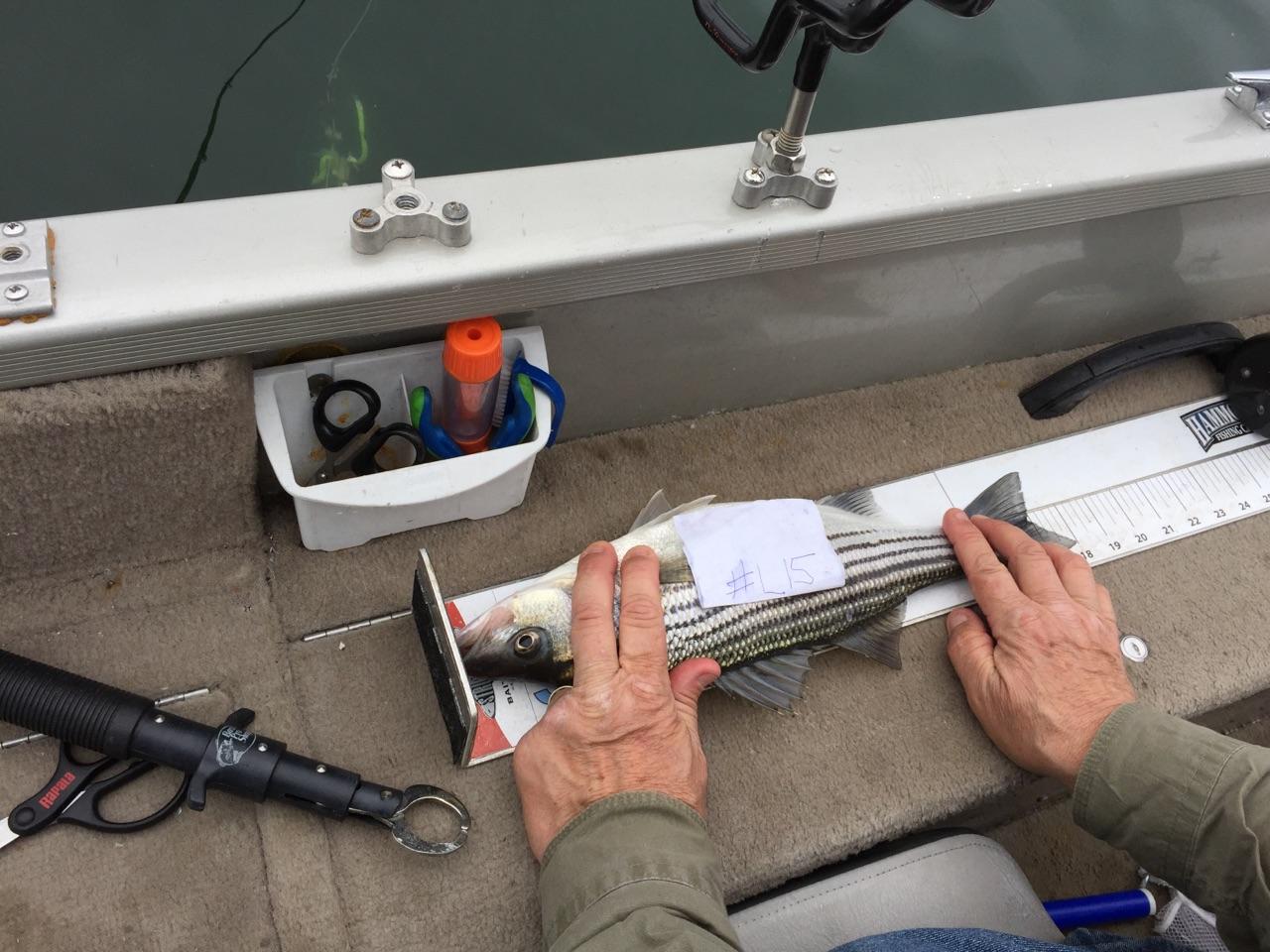 ​We launched at Gainesville Marina today and bee-lined it north to Holly Park. We arrived to find 75 degree surface temps and put out my usual spread of everything which included 2 weighted Planer Boards with 2 large shot weights each 4 feet from the hook and 55 behind the board with Blueback Herring over a 40′ bottom; 1 weighted directional bobber on the right 35′ out; 2 Downlines staggered at 20 and 25 ‘; 2 weighted Freelines 100′  with same large shot weights 85′ and 100′ back; and a herring transom bait right at the surface of the water. My crew today was Hannah and Dave. While I was trying to set up the video camera a striper hit the port Planer Board. It was 26 ¼” and weighed 8 pounds.