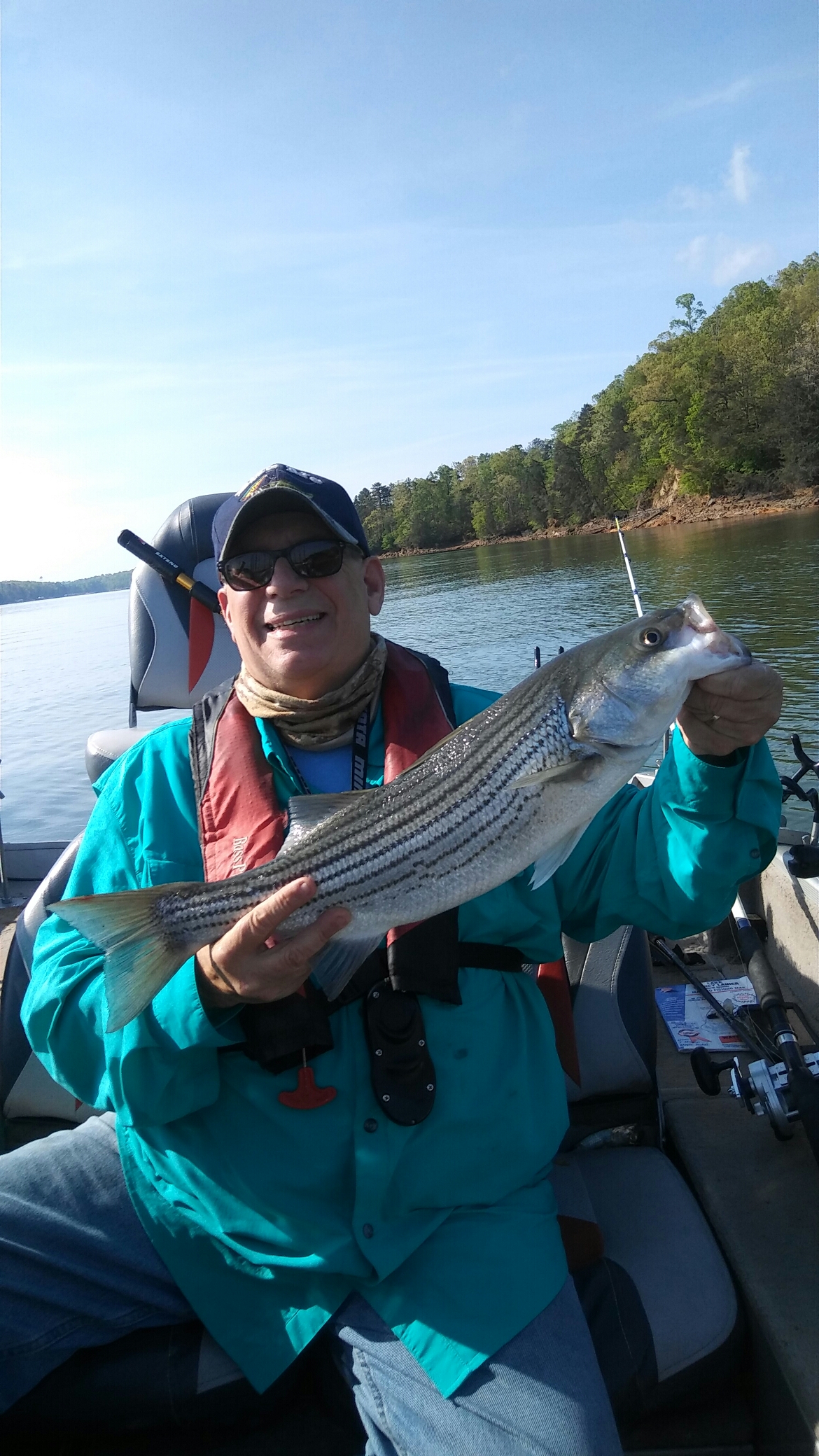 While loaded for bear today we went up river from Clark’s Bridge with medium shiners, blueback herring, rainbow trout and medium gizzard shad. We were not able to get up to Lula Bridge being stopped a few miles south by a stump field. Today’s crew was BFF Dale Burrell and fishing buddy Bob. The weather couldn’t have been any better with no wind and sunny, but we didn’t get any bites until midday. Today’s creel was 3 spotted bass, 1 blue catfish about five pounds and a 24” striper.
