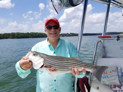 Pulling out all the stops using a strategy that included a specific fishing plan which consisted of launching at Gainesville Marina to access various fishing locations within reach of my boat. We offered several techniques until we finally hooked up in front of the Chattahoochee Country Club marina just outside the no wake buoys. It was a pretty good fight with the striper trying to swim under the boat. We did get him in for a short visit posing with anglers and measuring for inches before getting released back into the lake. It took about a minute helping him on the side of the boat until he splashed me in the face on his take off under the water. Adios until another day.