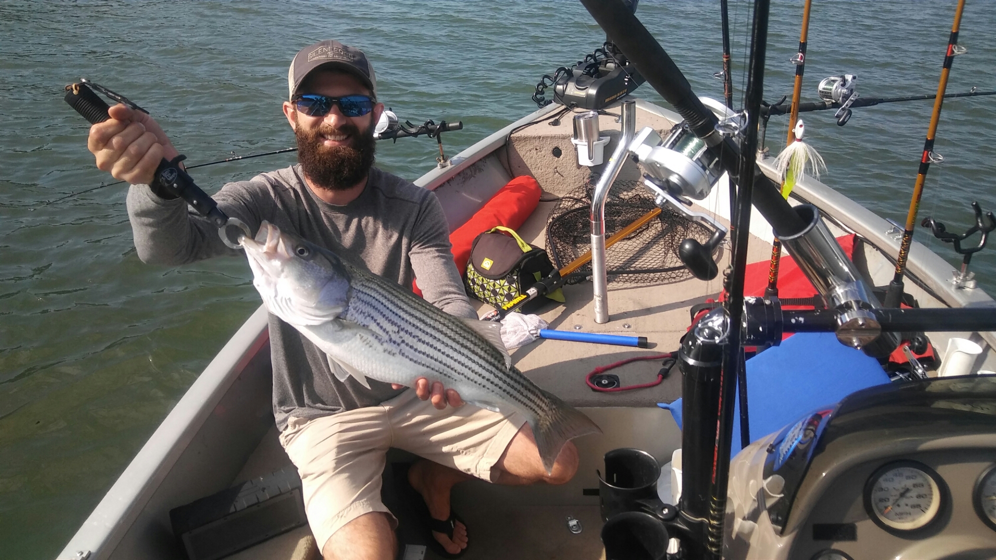 At one point we had a triple. Stripers and Spotted Bass were hitting all our lines at once. We were boating some fish while others got away.