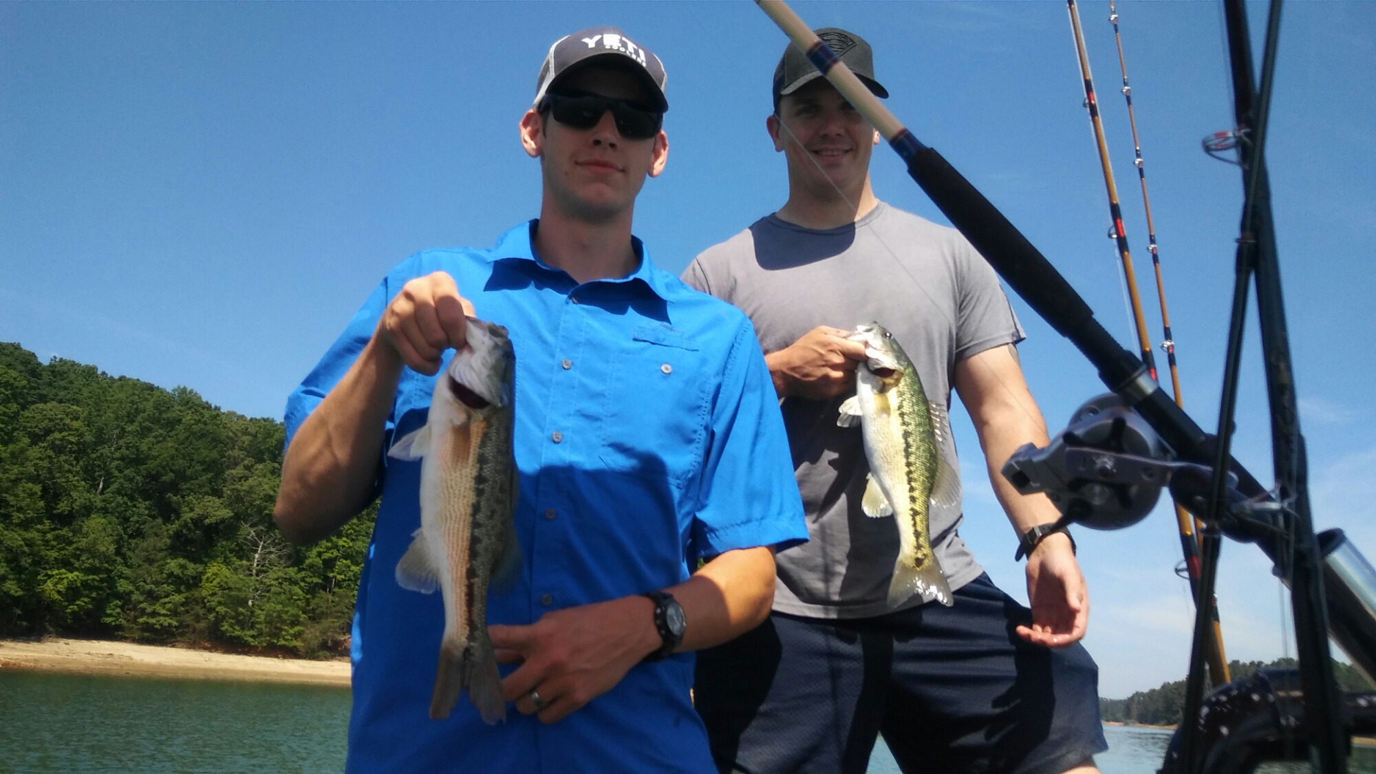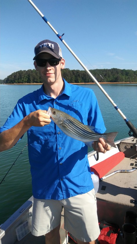 We left that area heading towards the Hooch and Adam noticed surfacing fish along the Chattahoochee side of the island that was marked C2 & C4 on the Chestatee side. We set out Planer Boards weighted and unweighted, Freelines weighted and unweighted and a right side directional bobber weighted all using medium shiners and it was Fish On. The next bite was John’s first Striper at 18”.