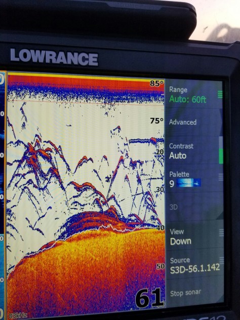 Today the Lanier Striper Club tournament was held with lines in at 6:30am and weigh in at 2pm. My baby sister now ranks up there with most men having the many years of experience with trailering a 22′ boat, the ability to maneuver up to a courtesy dock and the keenness to be able to locate stripers on her own. She deserves the respect that most boat captains get. Lynn put us in a cove at Lake Lanier Islands at 7am and it was Fish On. We came up on this screen.