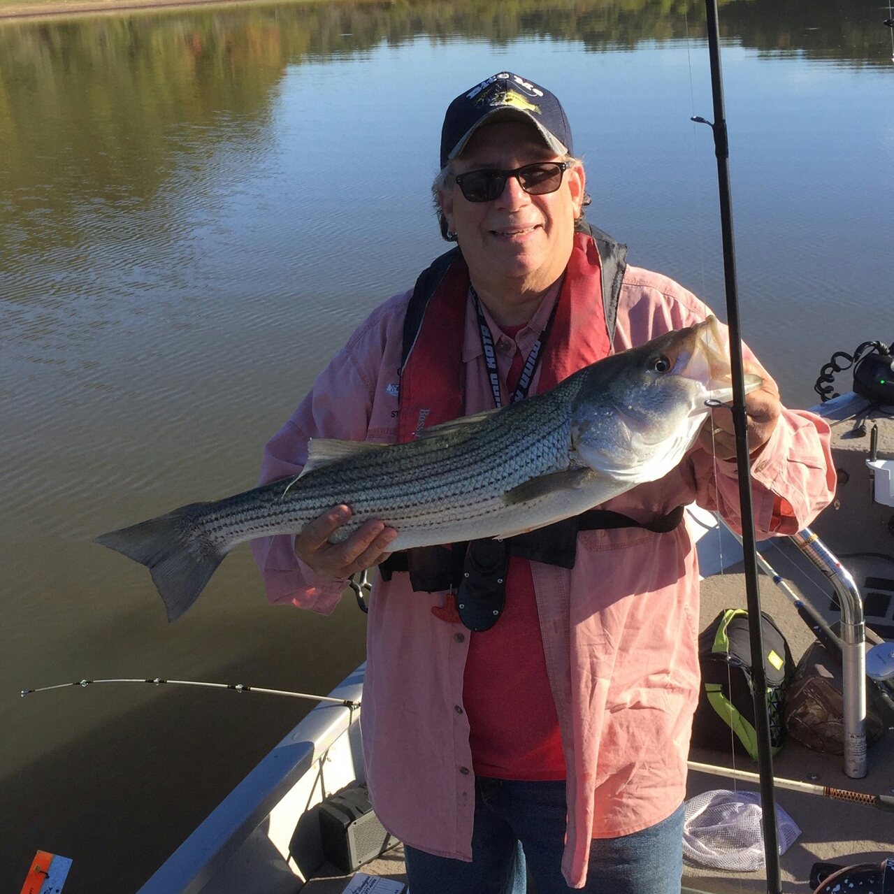 The same pattern worked again today fishing in 58° water around 1pm. We were pulling boards and free lines with medium shad when we both heard that familiar zing sound that reels make when a fish is on. We looked around to see which rod went off and couldn’t tell as none of the planers were tripped or any of the lines were moving at all. I told Bob to pick up one of the planers and reel slightly and sure enough it was the right one because the planer board buried itself beneath the surface. At one point the striper cleared the surface for a brief second before taking off again going deep. Bob turned to me and handed me the rod and said “your turn”. I grabbed the rod as the striper continued to strip line out of the reel. Give and take, give and take, adding drag a little at a time. I finally saw the planer board and the shad still running up the line. This fish still wasn’t ready to come in as it turned and went toward the motor. Partner told me not to worry as he dipped to net the fish and it bent the hoop of the net as he raised it into the boat. After measuring it at 32 ¼” and taking pictures the striper was back in the water to be caught another day.