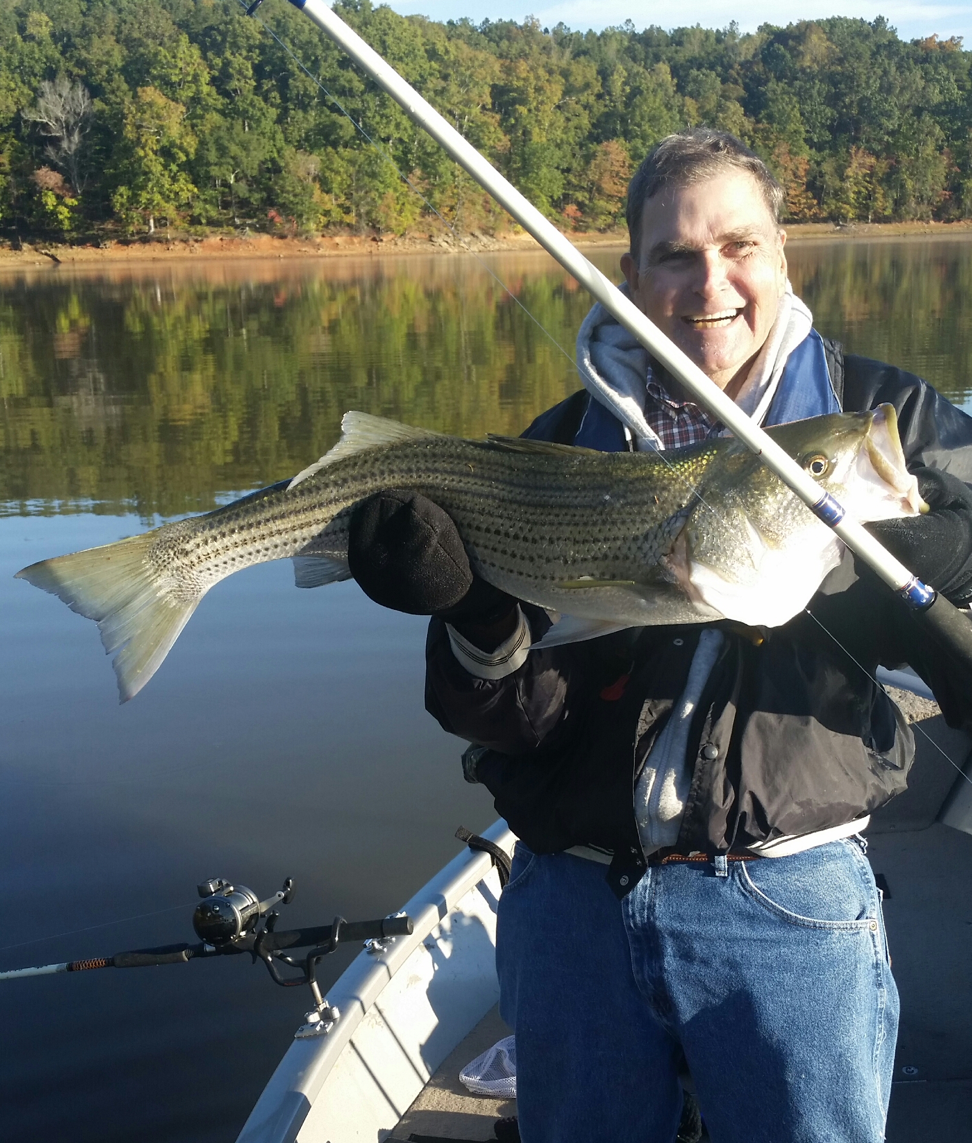 With the air temp at 38° at 7am – brrr, we launched from Laurel Park ramp since the Clark’s Bridge courtesy dock was now in inches of water from the lowered lake levels. We cruised up to Clark’s Bridge bay on a tip from a fellow striper angler. Water temp was 48° as we circled the bay in front of the ramp and did figure 8s in the hopes of starting out the day with a nice striper. After just a few minutes the starboard planer went down with a medium shad and stinger but no fish on and the shad had its tail bit off and it lost an eye. With no confidence fishing here we left heading farther north only to find 44° water temp and no life anywhere on the screen because of the colder water. We decided to head south to find warmer water. We had been fishing all morning in the main lake channel and needed to change our approach. With the morning temps being heated up by the sun which finally came out from behind the clouds, the water temperature hit 58°. Positioning ourselves in the mouth of a creek with a 50’ bottom we got hit at noon thirty by a 34 ¼” striper. This was our first transom bite ever. The shad was only 20’ behind the boat and went 60 feet out in 10 seconds. Bob grabbed the rod as it continued to strip out line. I reeled in the adjacent rods as this fish was going wherever it wanted to go. After the fish tired he was easily reeled in close enough to net it and lift into the boat. This was no skinny river fish. After measuring it and taking pictures we released this fat boy back into the lake.