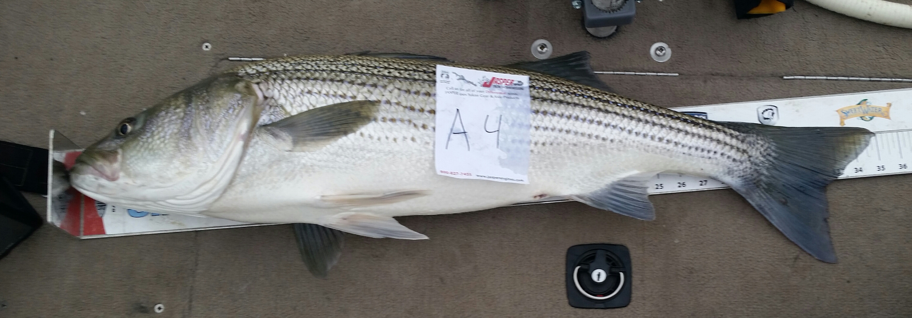 This fish was a lot closer to the boat than the first big striper but it seemed to take twice as long to get him near the boat to be netted. Again Bob started reeling as the catch started stripping out line clicking the reel furiously. Again it was back to give drag and take up line back and forth until the striper tired. After getting him into the boat and onto the ruler we realized that this fish was longer than the other big striper we caught. Well this fish just raised our total two fish length to 70 1/4″ and a respectable number to take to the weigh in. After the tally of inches for all those members at the weigh in it was determined that Team Fish Hunter got the biggest fish but also got 1st place over all in the tournament. Congratulations to Bob Fields and Team Fish Hunter for an outstanding performance.