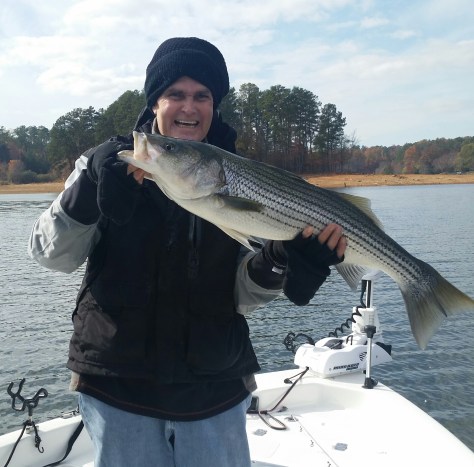 I hope the stripers will be there on Saturday. We launched the boat early. Air temp at the water’s edge was 55°. We definitely had bundled up. Caught our first 33 1/4″ striper in twenty minutes on a freeline shad 150′ behind the boat.  We only brought 4 gizzies and one salty with us. Should have brought more.