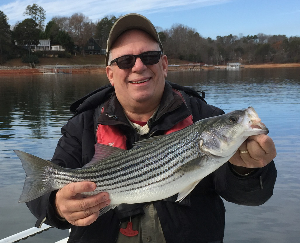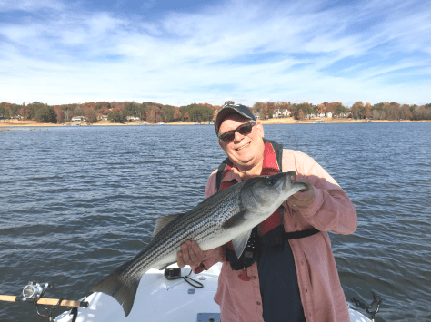 We had launched at Laurel Park and headed to Wahoo Creek on a tip from a fellow angler. We marked a few fish at the end of some long bait clouds but were unsuccessful using planer boards, freelines, diagonal bobbers, downlines and a transom line. We used medium trout, medium shad and some hefty looking bluebacks to no avail. There were two other striper boats in that same area. Nobody caught anything so we left and headed for Gainesville Creek. We didn’t mark anything there. We changed our tactics and tried downlining in the main channel which was tree-free. No takers. Finally we switched to umbrella rigs 120’ behind the boat and hooked up. Today’s water temps remained in the low 50s making the stripers slightly lethargic which is why we were only successful with the reaction bite.
