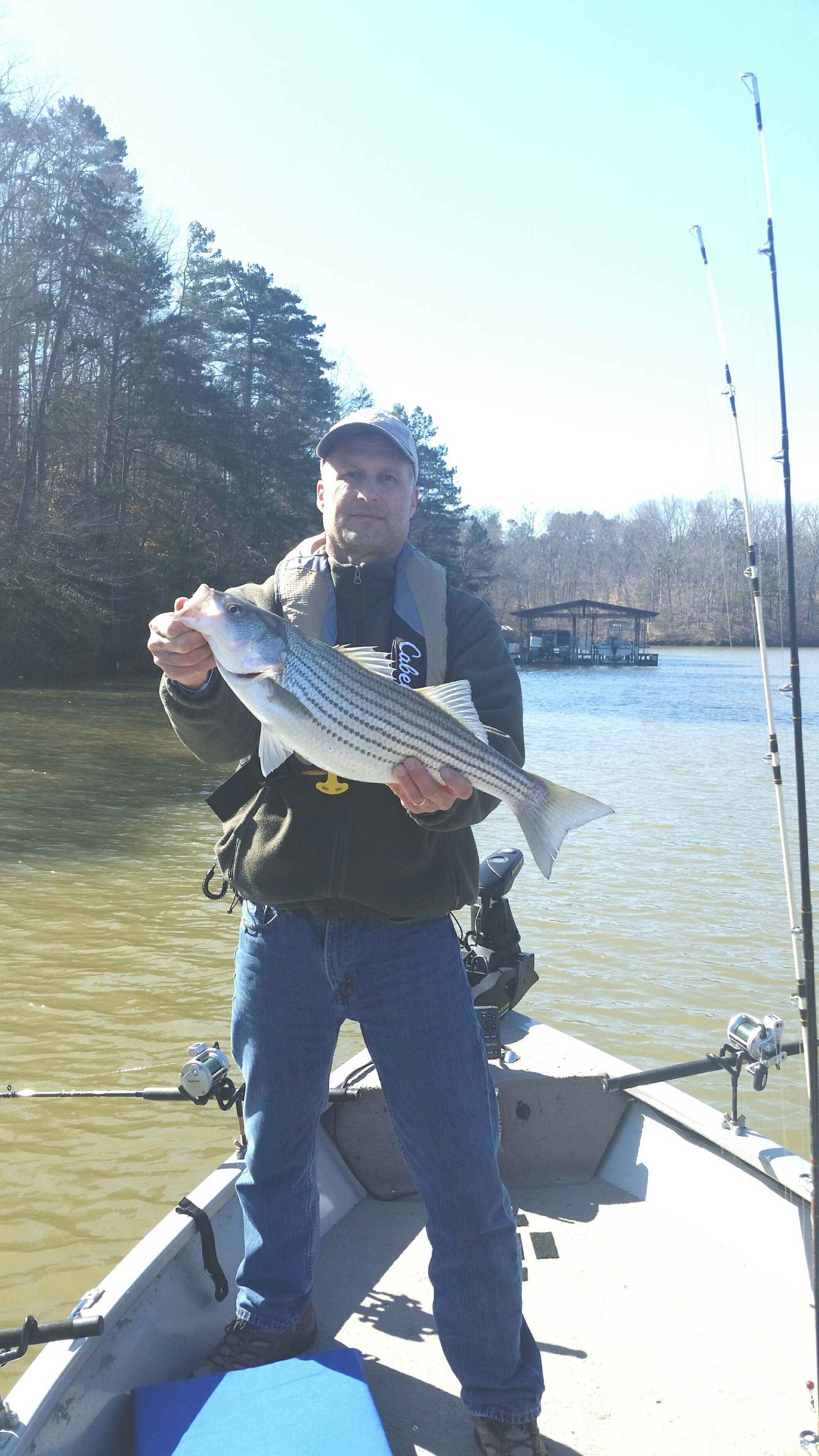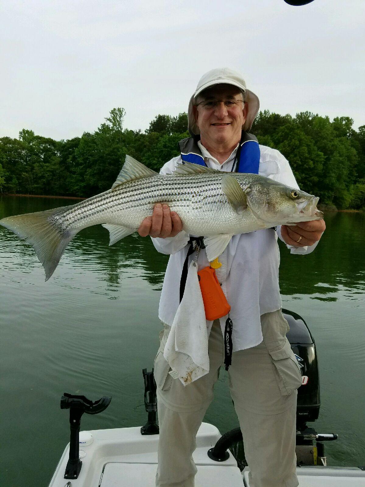 Thirteen anglers met at Rabbittown Saturday morning April 2nd, had breakfast then headed to the Tugalo River Lake Hartwell. Five boats launched at Stevens County Park and followed the channel north using our navigation mapping to stay out of the shallow areas as we neared the target area to be fished. Fishing today was to be the  mid season Hybrid run just below Yonah dam. Once we reached our destination one by one each boat stopped about 100 yards in front of the next. We started out at the first bridge and while getting our lines out we had our first fish on. It was a Hybrid which weighed 9 pounds caught by Dale Burrell on a blue back planer board. It measured only 26 and a half inches but it was full of fight. Another incredible day on the water, sun was shining, blue sky, fish were being caught by all of the boats, some stripers but mostly Hybrids. The bite turned off for a while and then it picked up a couple hours later and again the bite was on with several boats picking up one or two more fish. Well it was the wind’s turn to engage us gusting at 25 mph. This was the first time ever I ran 2 wind socks and that kept our speed down to 1 mile an hour. We decided to stop a 1pm and all headed back to Atlanta with some stopping off again at Rabbittown for some lunch.