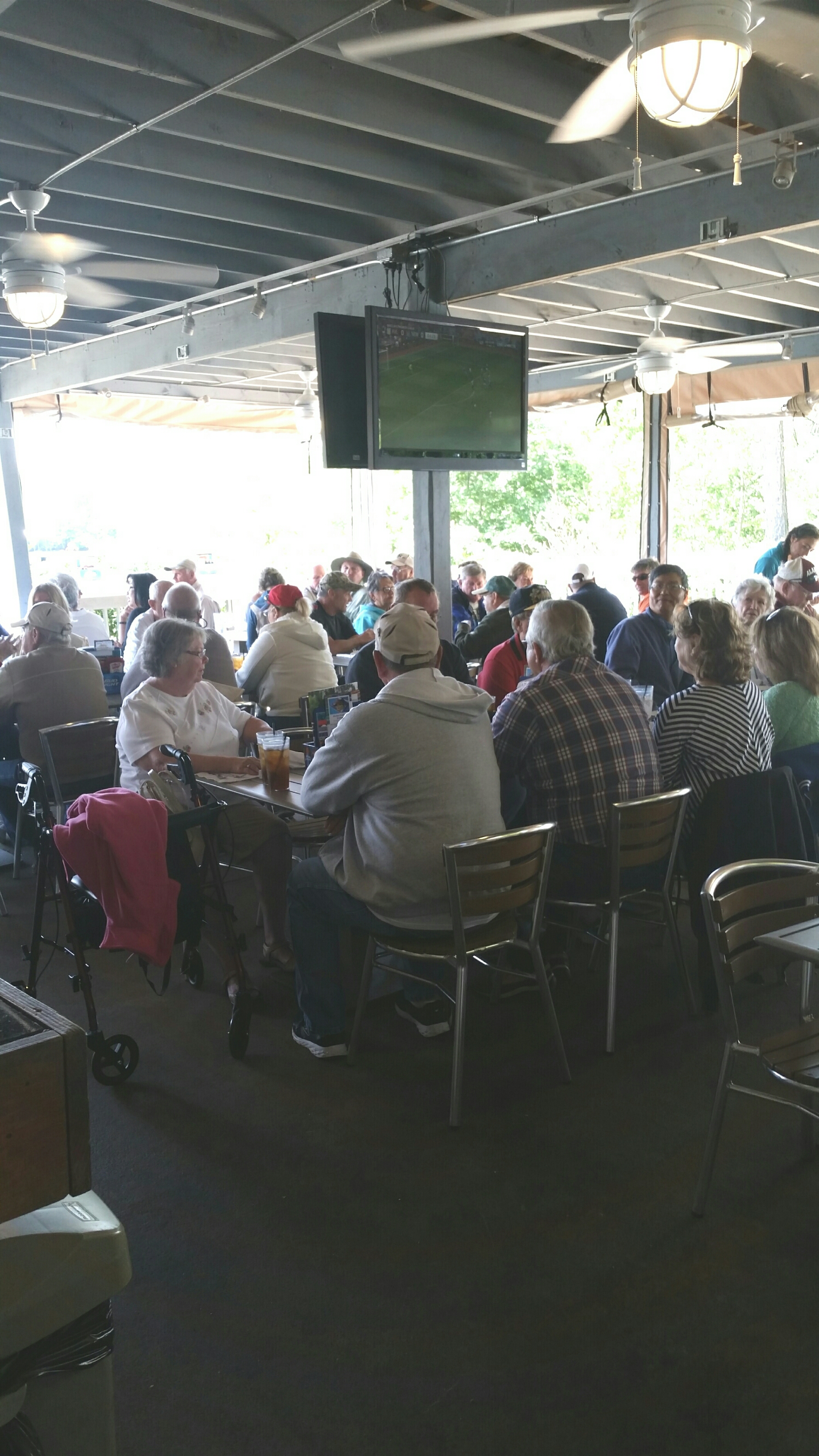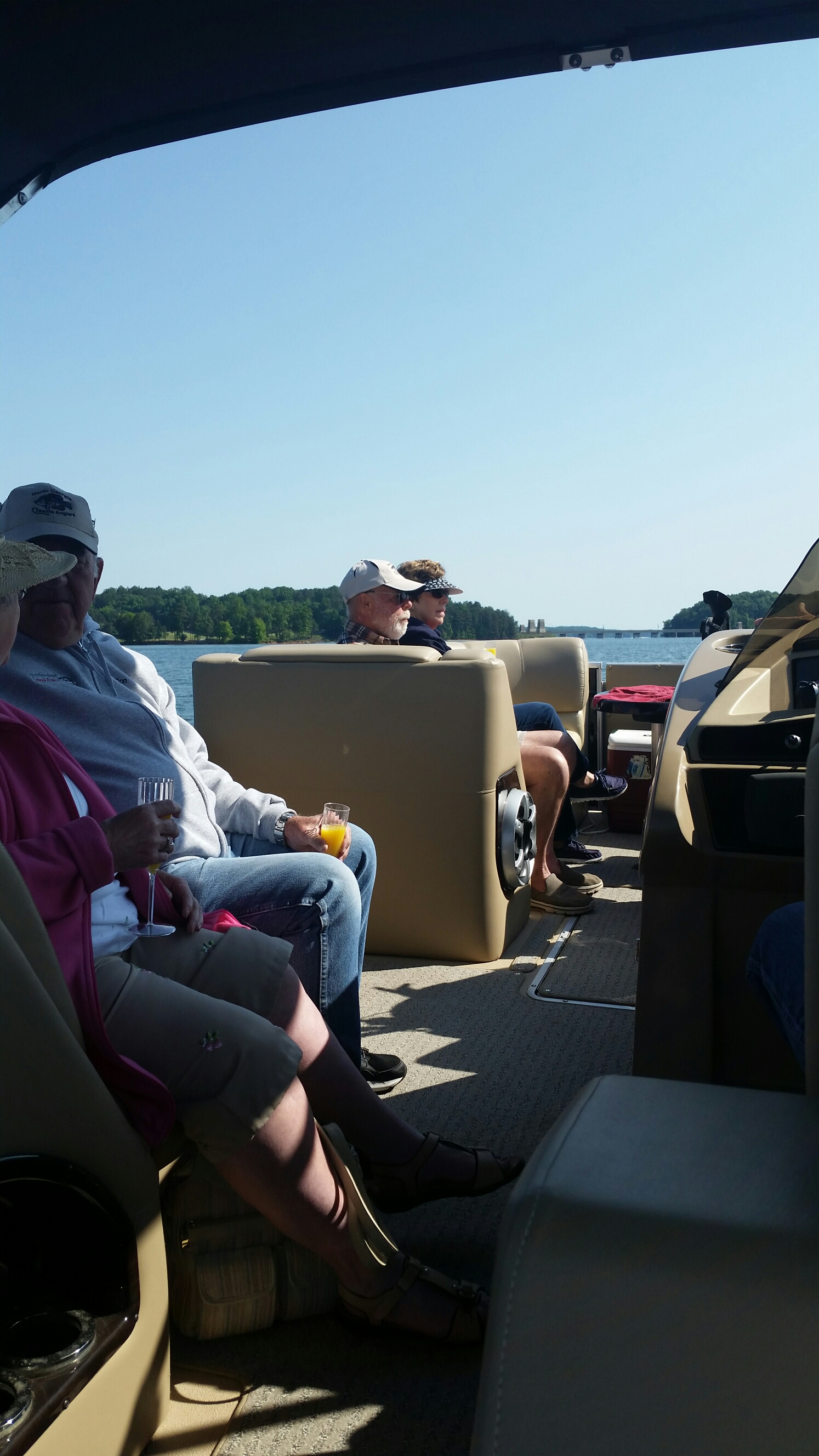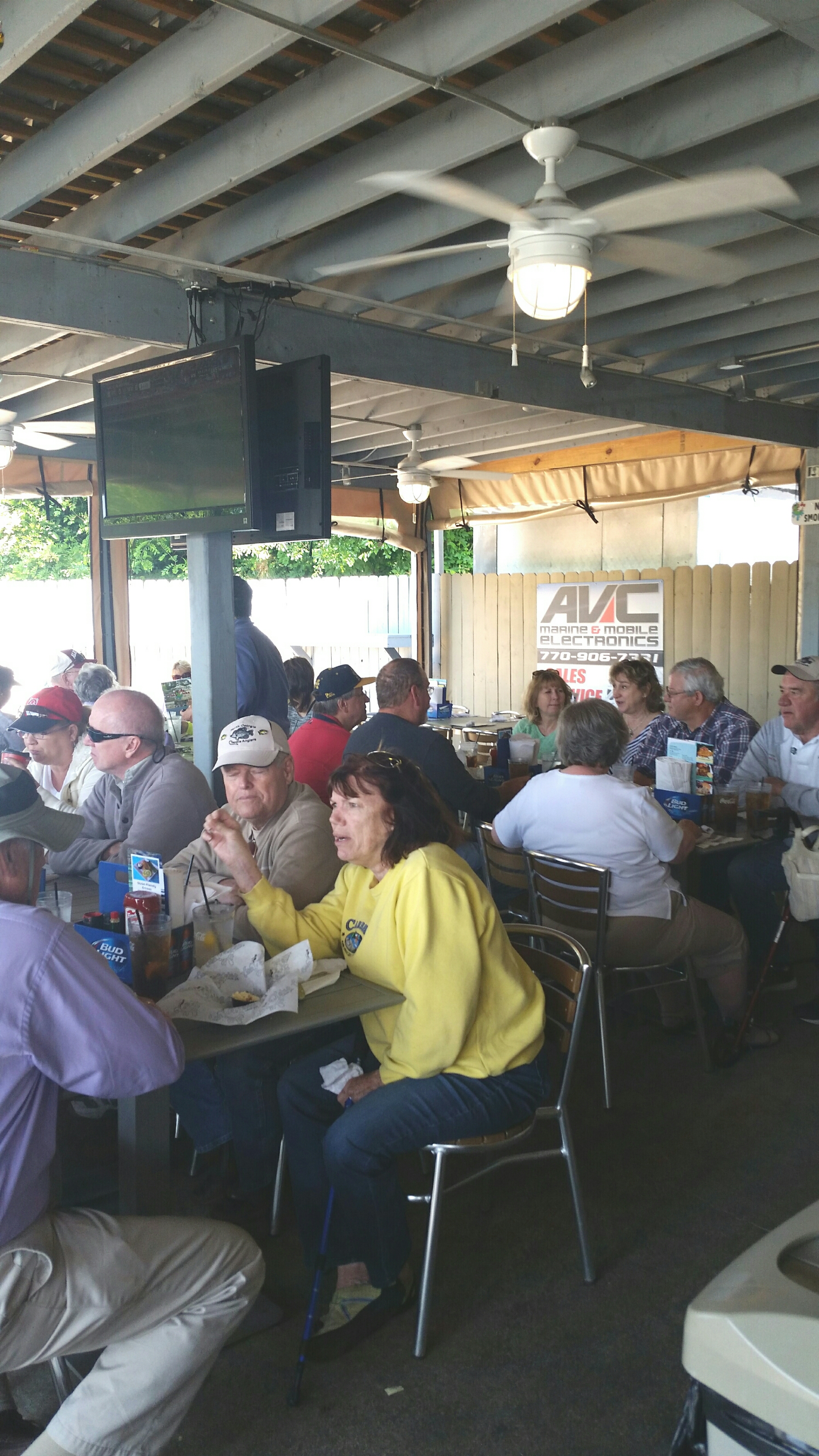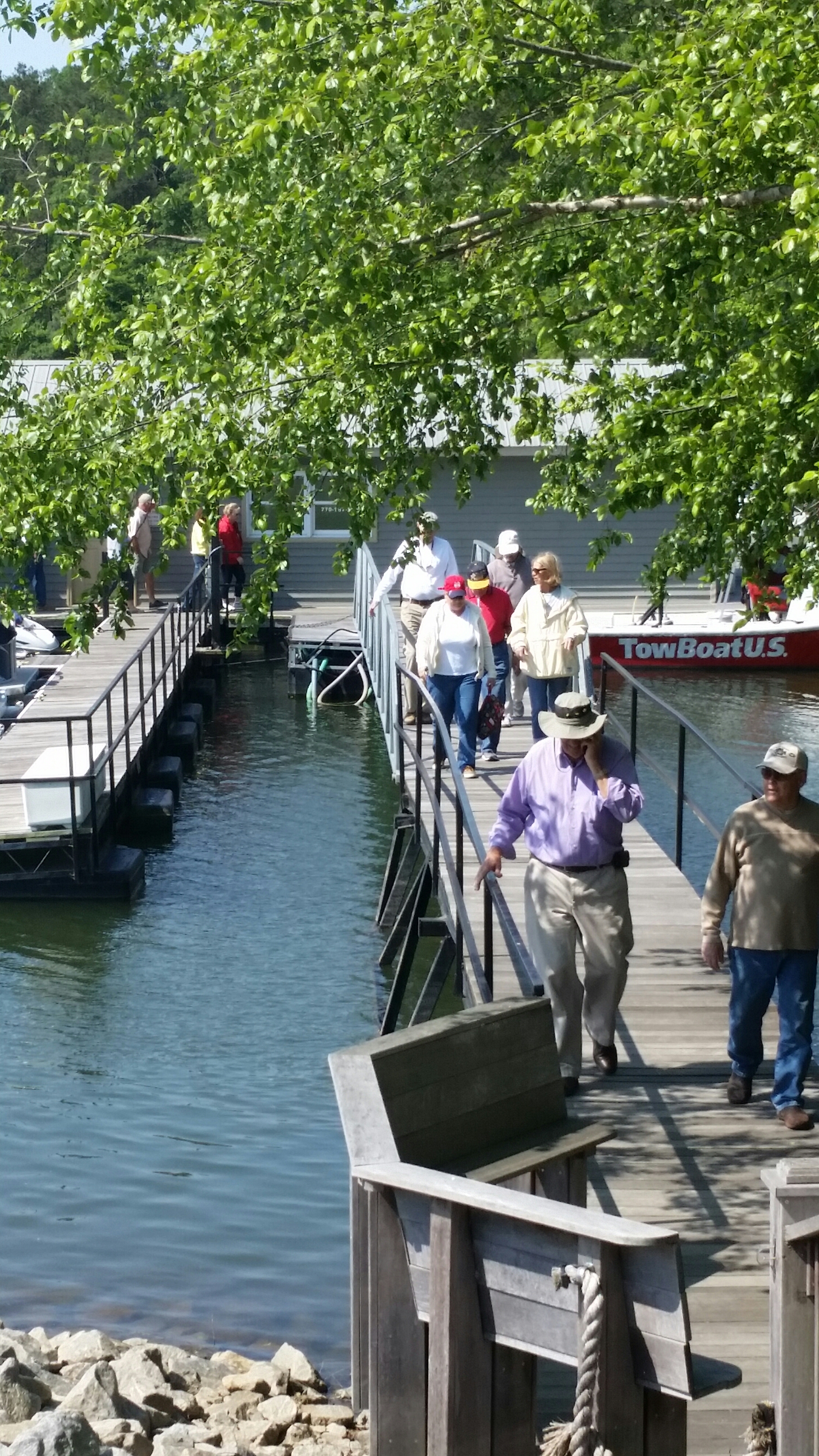Several pontoon boats met at Three Sisters around 11am this morning. We followed each other to the back of Flowery Branch to Hideaway Bay Marina where the Fish Tales restaurant was located. Thanks to Mike Martin and his wife Joan for taking me on their Cadillac pontoon boat. I went straight to the Barcaloungers on the back of the boat to witness the awesome power of the Mercury 250 horsepower 4-stroke motor that was quietly moving the boat forward as the panoramic view of the Three Sisters disappeared behind us. Watch Video #1 at the bottom of this article. The Fish Tales restaurant was clean, friendly, had great food and prices too. Our club fellowship at the luncheon made this outing a complete success. Thanks to Woodie Malone for the organizing this great event.