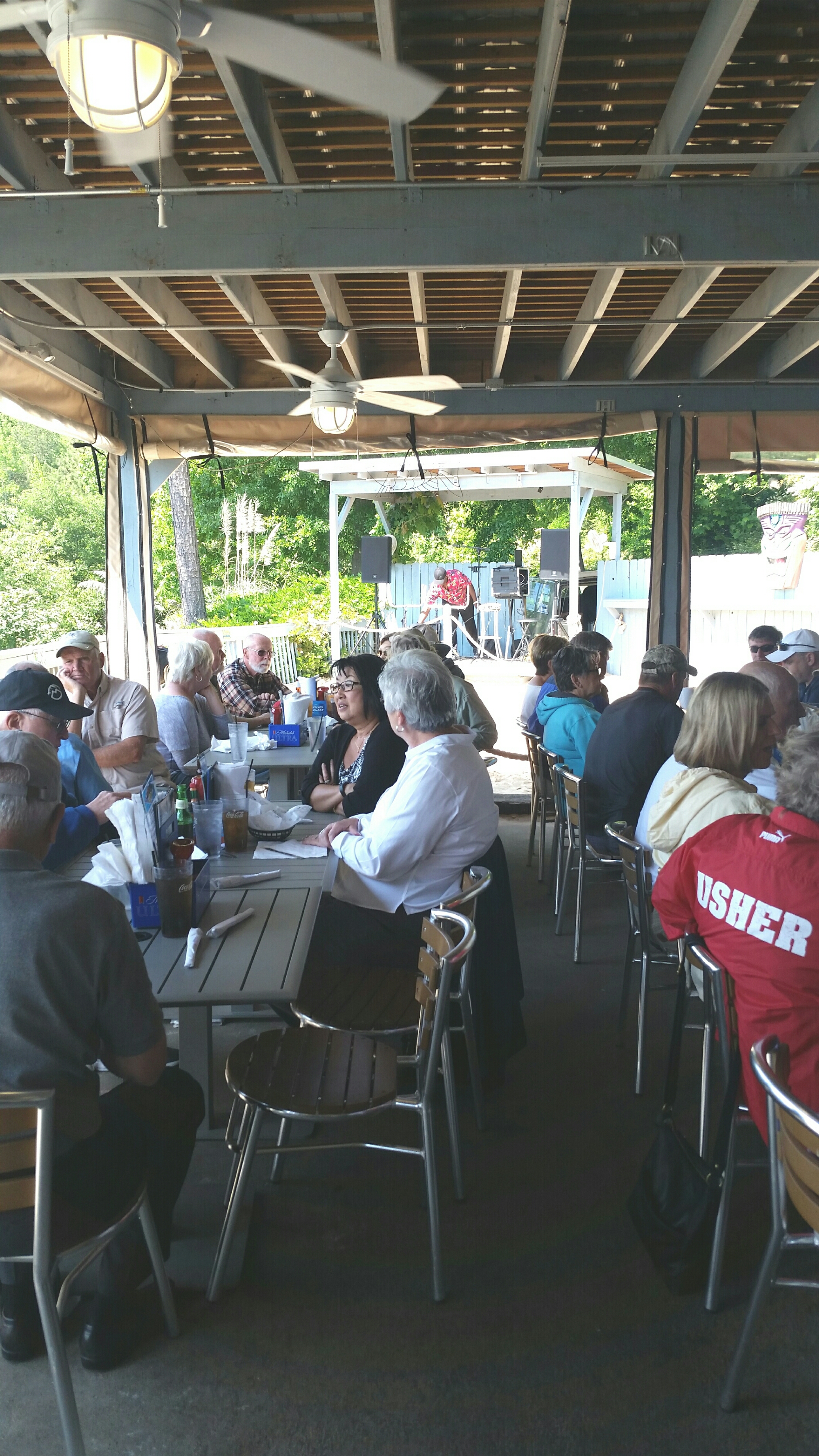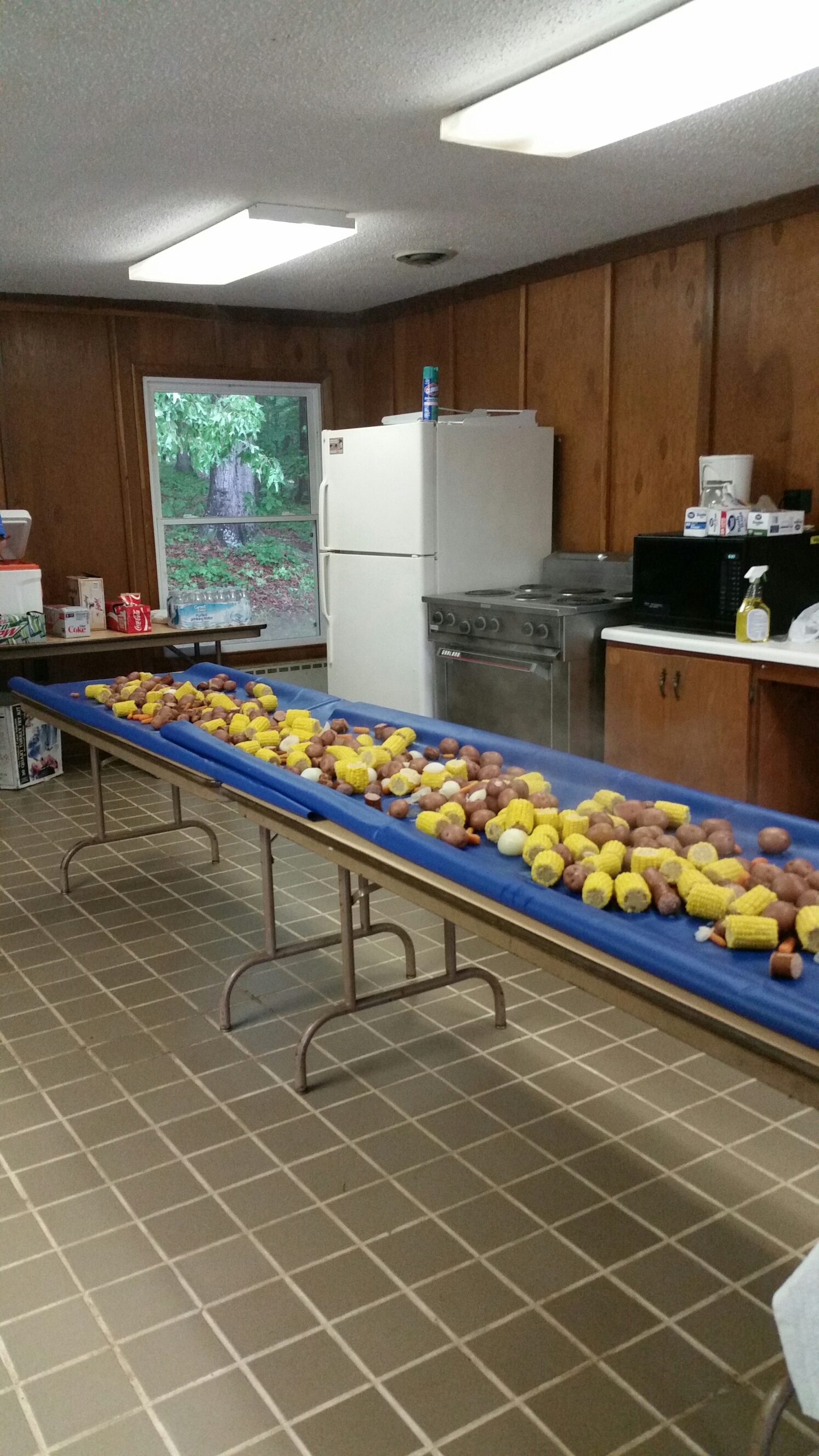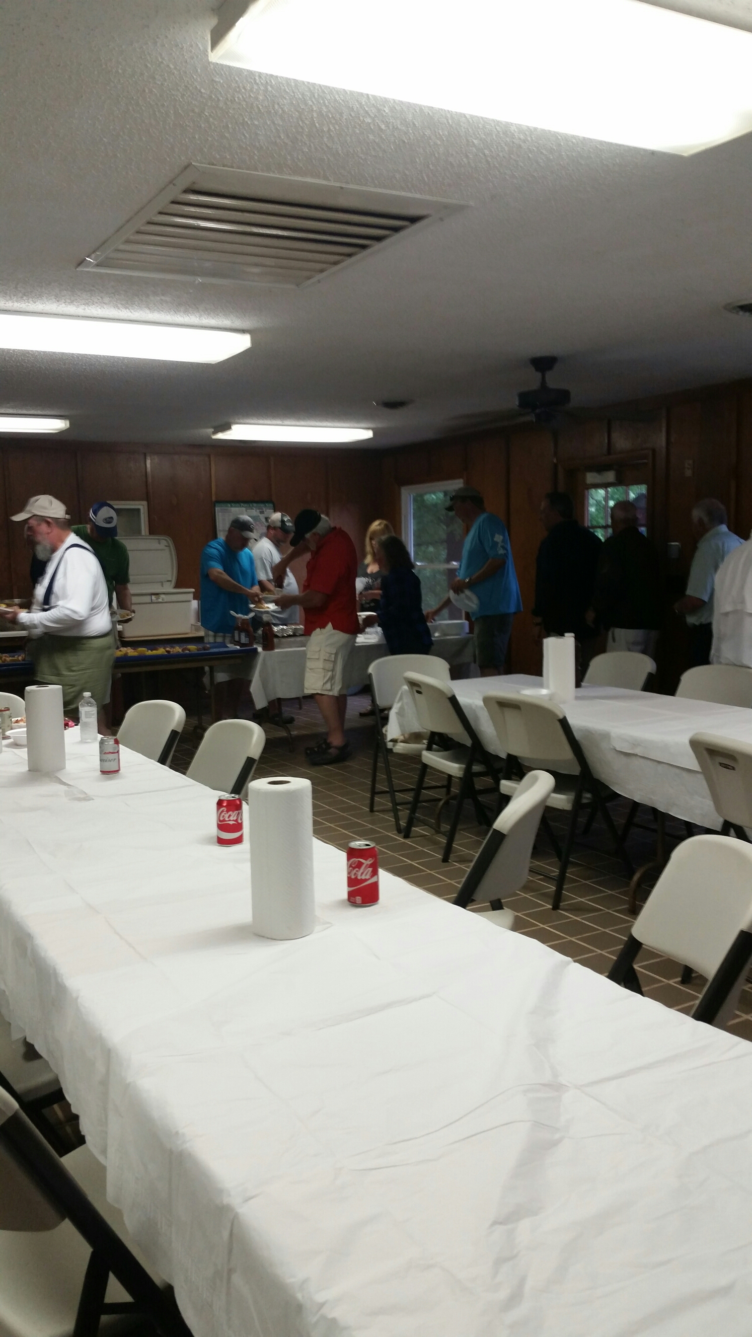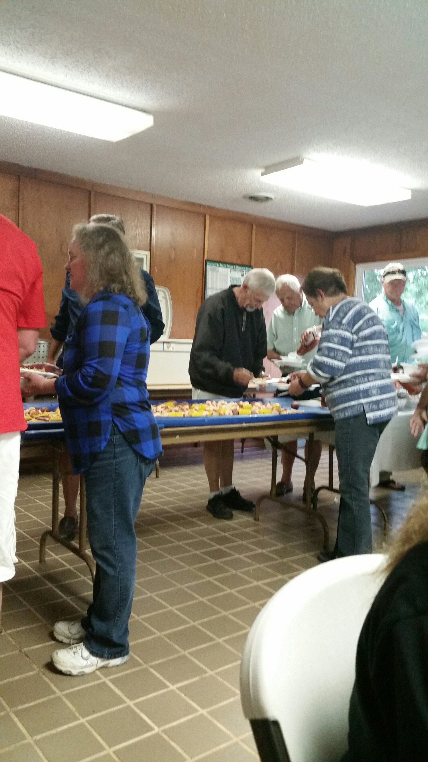 We arrived on the Tugaloo river around 8:15am just north of Stephens County Park ramp. Our first gizzard shad went into the water without a hook. Oops. Still had 3 left and 4 dozen blueback herring. While fishing was a little slow we managed to catch and lose 11 Hybrids over the six and a half hours that we fished. The four Hybrids we caught came about 1 and a half hours apart then we doubled during a lull which tangled 5 rods into a Charlotte’s web. These fish were strong and fought hard which surprised us when they hit. Between the laughs, jokes and comments it was a pleasant trip up the river while the rest of the club fished the main lake. We got a little rain around 3pm and decided to head to the ramp when thunder was heard. When we got to the boat ramp there was a small line of boats to get out as the rain really started coming down. As we waited for our turn to get the ramp we watched and laughed as this 22 ft Bayliner deck boat tried to go up on the trailer sideways. The next guy tried to get his boat up on his trailer and as he was gunning the motor he caused the trailer to be disengaged from the trailer hitch. Apparently the boat owner didn’t even have a pin through the transfer hitch to secure the trailer to his truck. The result was that he tried over and over to get the boat on to his trailer without it being on the ball. It was our turn after about an hour watching the boat ramp show. The rain had stopped at this point and we drove over to the Tugaloo State Park where our club was having a Low Country Boil in a park pavilion.